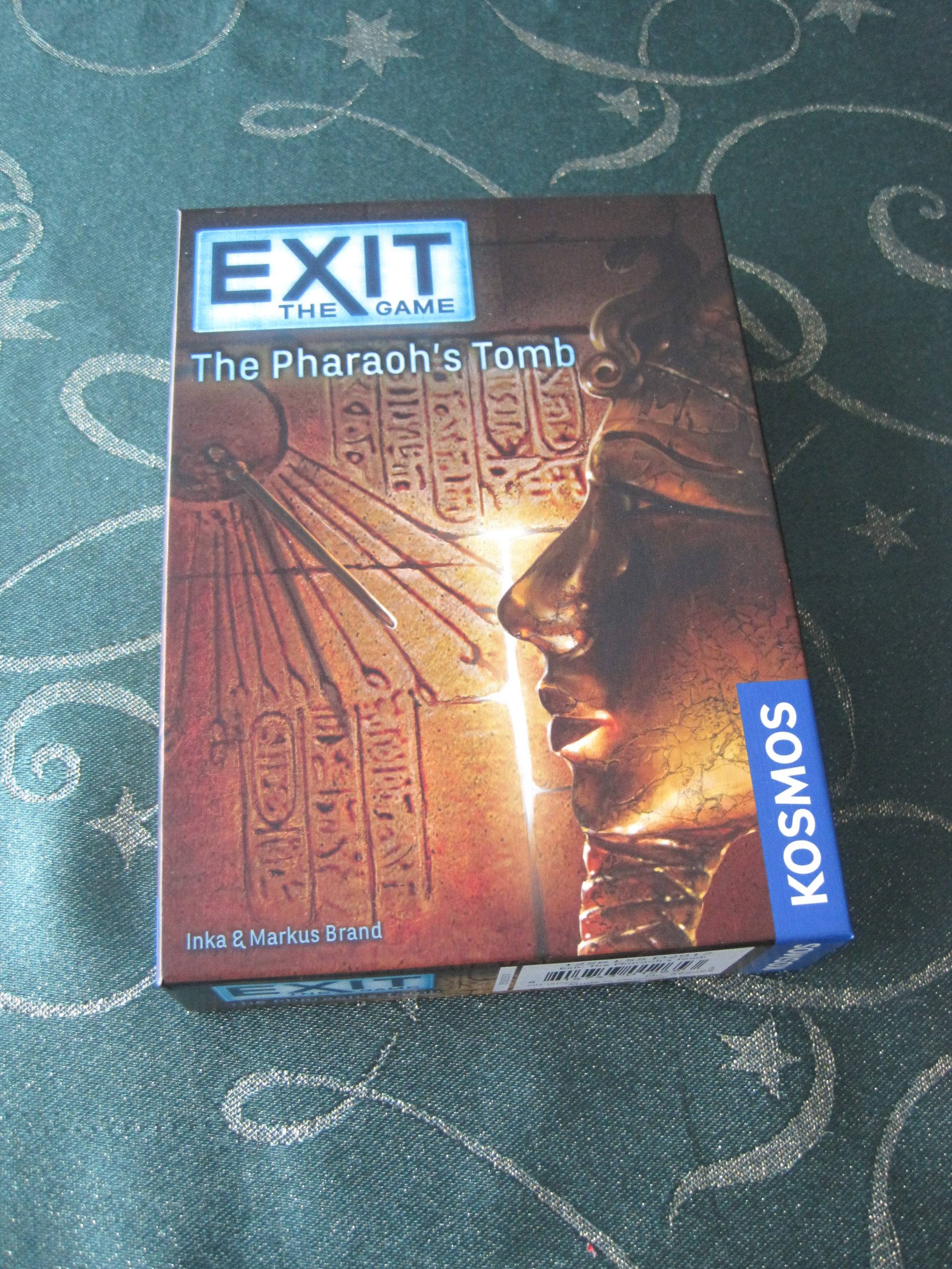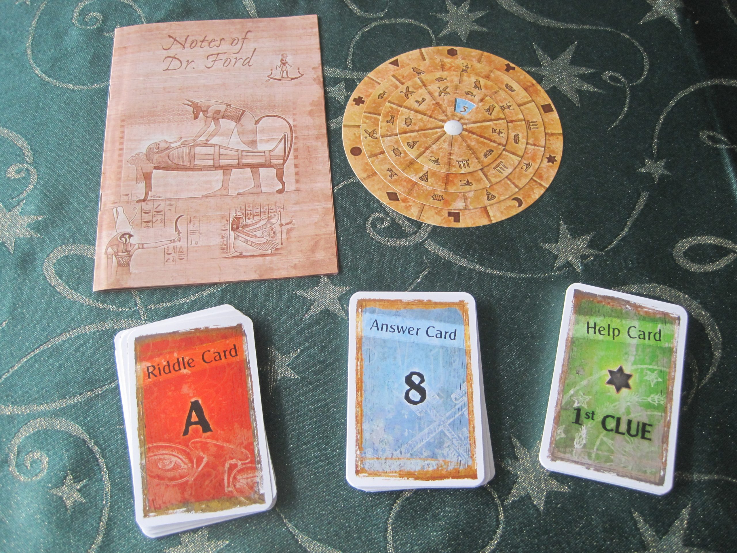 We tend to play as a group of four players, although a problem with playing as a larger group is that there is only one paper booklet for everyone to study. As well as the notebook, the box contains a deck of cards containing clues, riddles and puzzles and an Egyptian hieroglyphics code wheel.