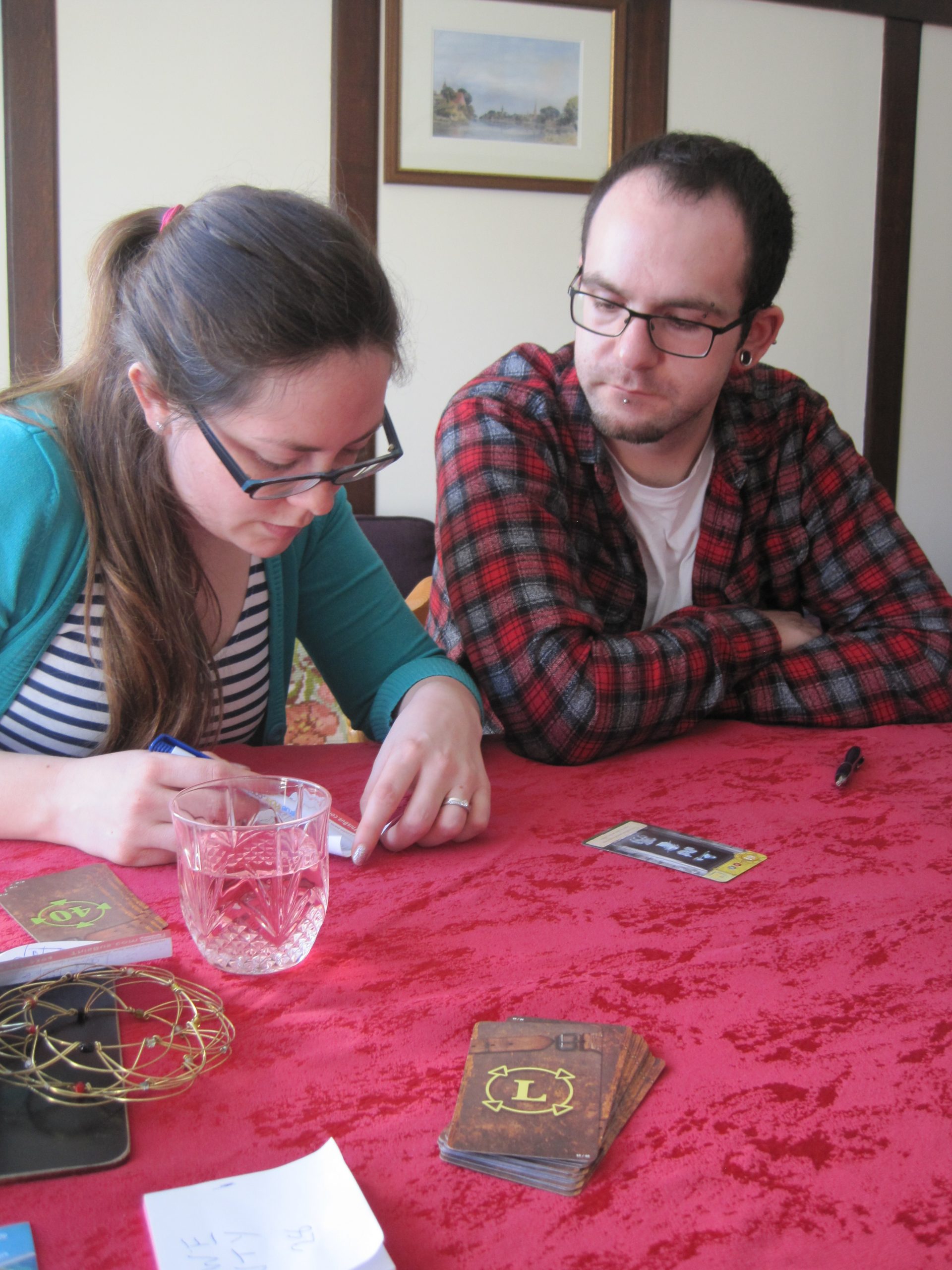 After reading the introduction card, we split into two groups and read the “new rules”. One team had crash landed in a deserted area and had to play with the yellow ring cards. the others found themselves facing a Greek temple and were to play with the green ring cards. we were told we must work separately.